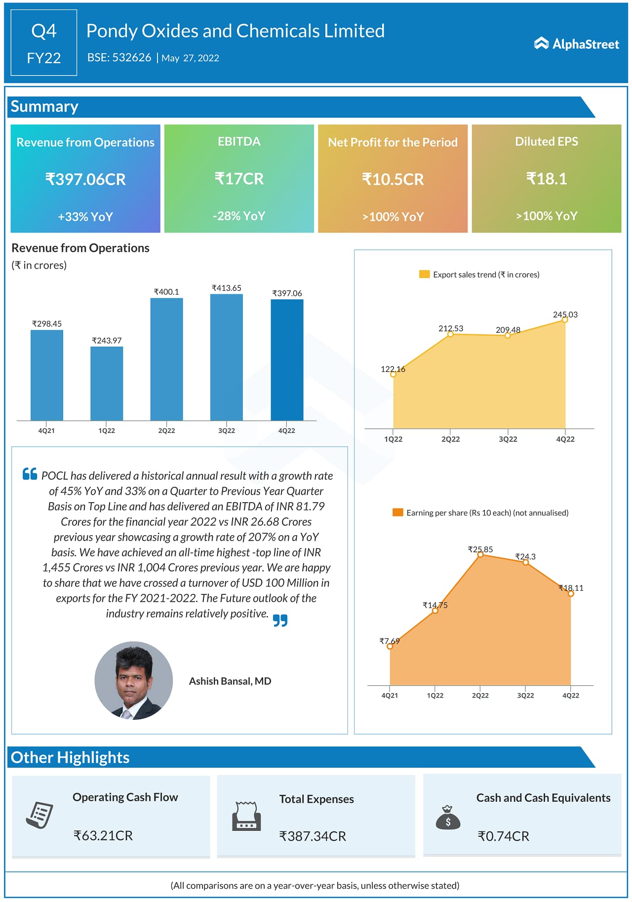 - POCL said it achieved an all-time highest topline of INR1,455 crores vs. INR1,004 crores the previous year. And also crossed a turnover of $100 million in exports for FY22. POCL is seeing the future outlook of the industry to be relatively positive.