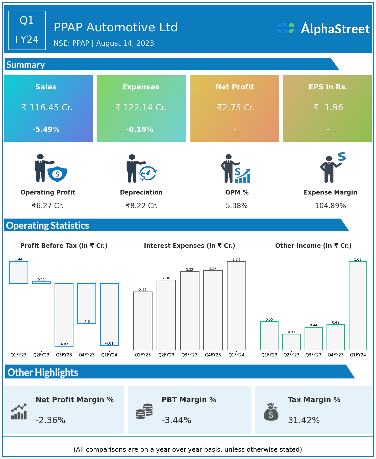 PPAP Automotive Ltd reported Revenues for Q1FY24 of ₹116.45 Crores down from ₹123.22 Crore year on year, a fall of 5.49%.