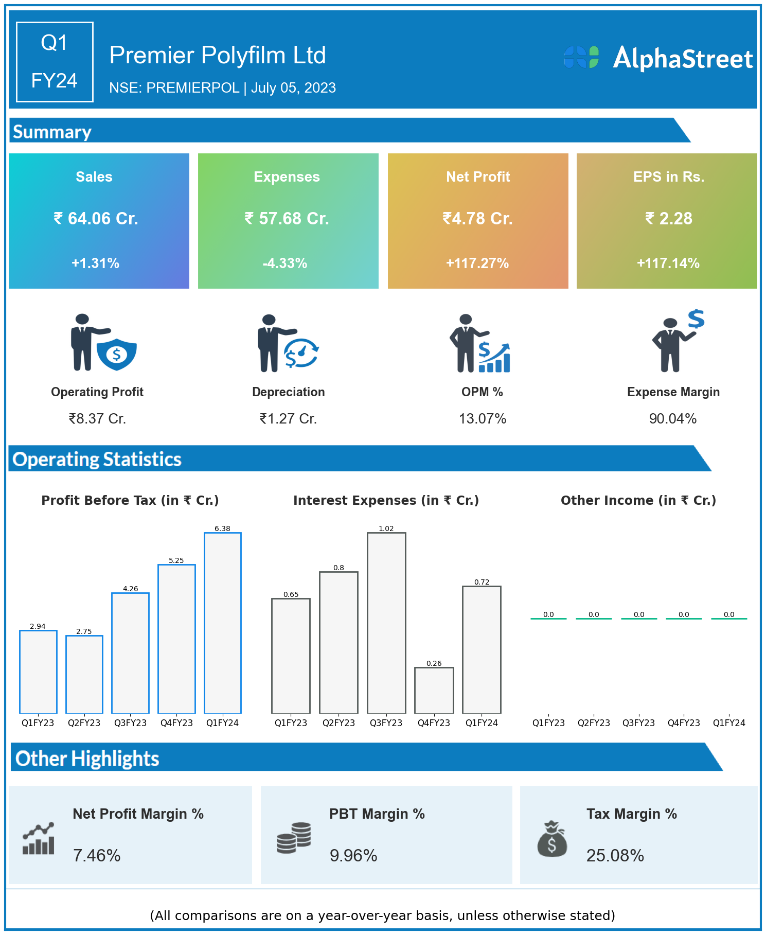 Premier Polyfilm Ltd reported Revenues for Q1FY24 of ₹64.06 Crores up from ₹63.23 Crore year on year, a rise of 1.31%.