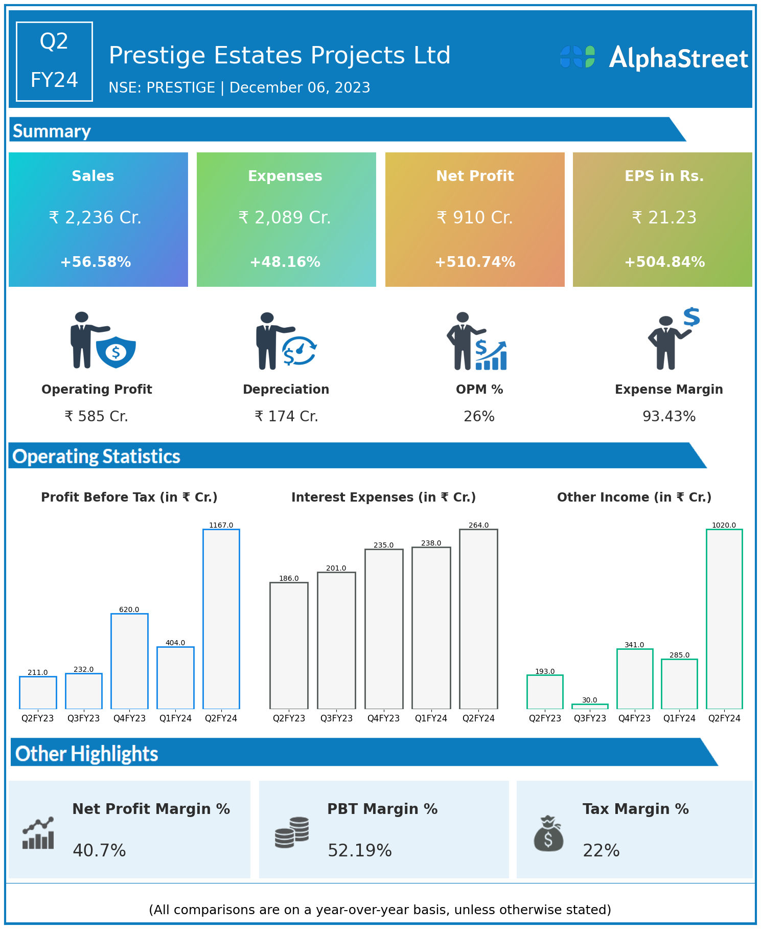 Prestige Estates Projects Ltd reported Revenues for Q2FY24 of ₹2,236.00 Crores up from ₹1,428.00 Crore year on year, a rise of 56.58%.