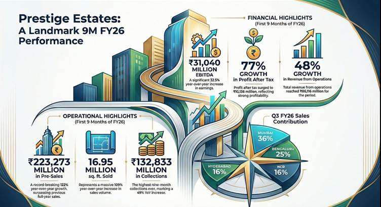 Prestige Estates reported record operational results for the quarter and nine months. Pre-sales in Q3 FY26 totalled ₹41,836 million, a 39% year-on-year increase, and nine-month pre-sales were ₹223,273 million, up 122% and exceeding the company’s previous full-year peak within nine months. Volumes for Q3 were 2.99 million square feet with 1,811 units sold. Nine-month volumes reached 16.95 million square feet with 8,598 units sold. Average realization improved to ₹14,459 per square foot, with plot realization at ₹9,165 per square foot. Collections for Q3 FY26 were ₹45,475 million, and nine-month collections were ₹132,833 million.