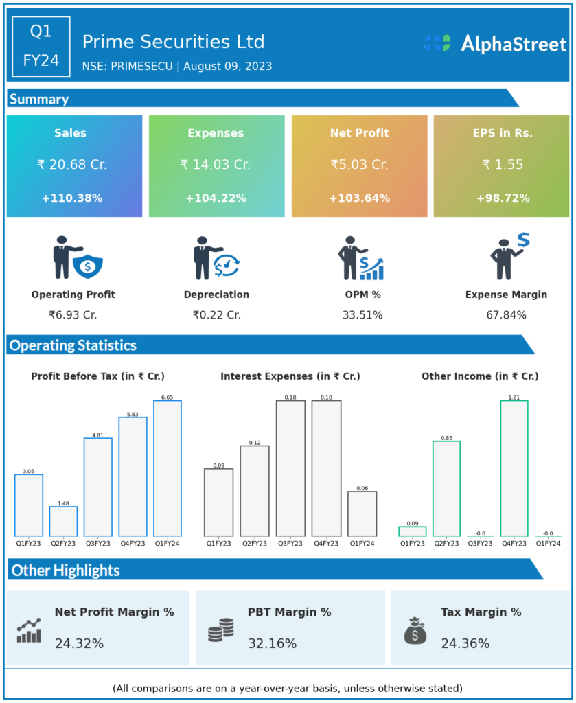 Prime Securities Ltd reported Revenues for Q1FY24 of ₹20.68 Crores up from ₹9.83 Crore year on year, a rise of 110.38%.
