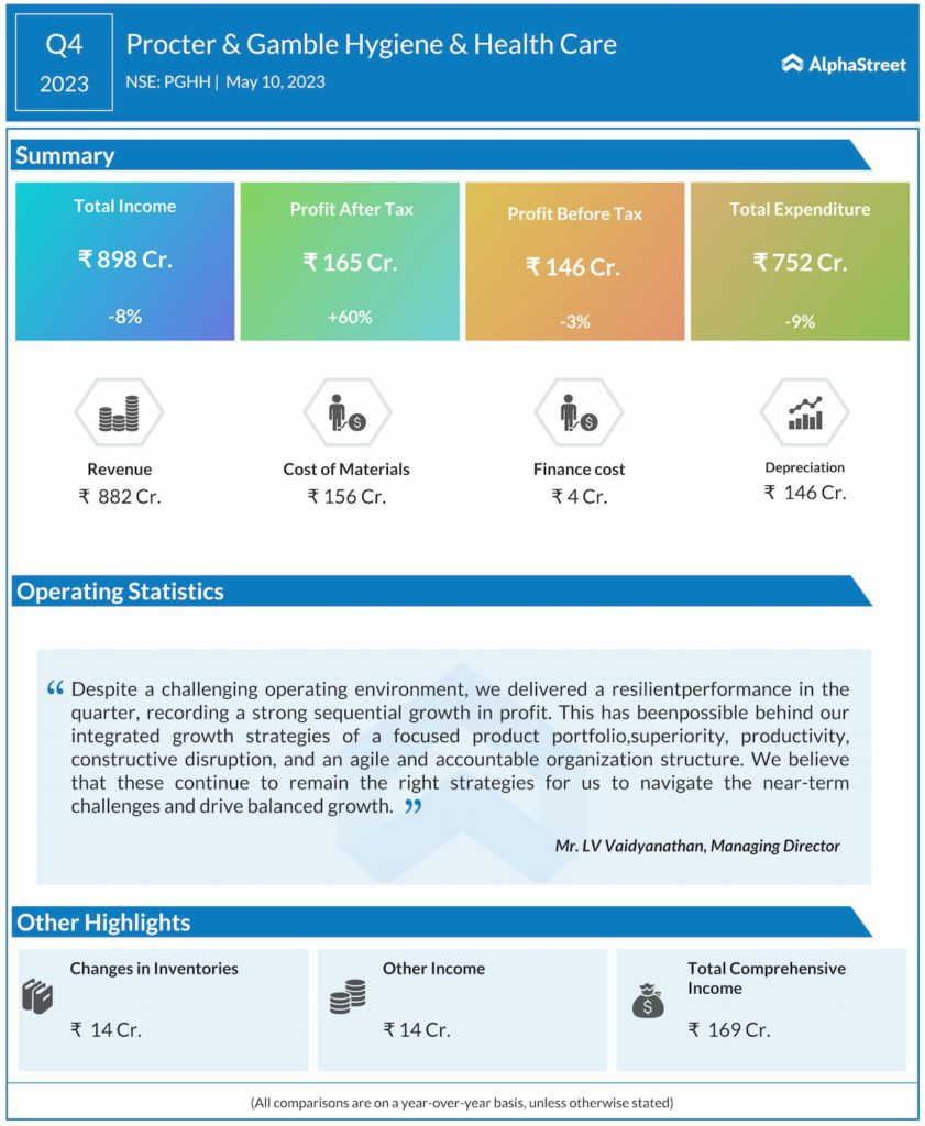 Procter & Gamble Hygiene & Health Care’s total income in Q4FY23 fell 8% to ₹ 898 crores. Consolidated Profit After Tax came at ₹ 146 crores in Q4FY23 showcasing a 3% fall in profits on YoY basis.