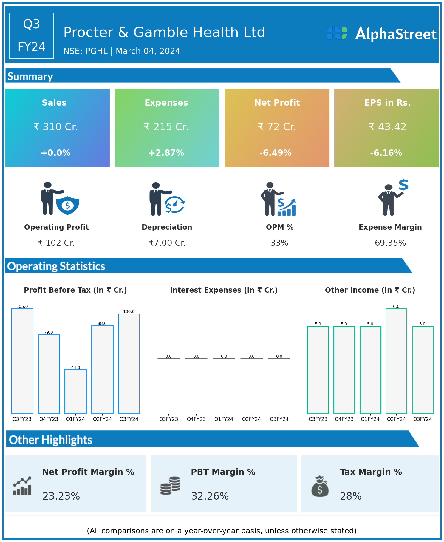 Procter & Gamble Health Ltd reported Revenues for Q3FY24 of ₹310.00 Crores same from ₹310.00 Crore year on year.
