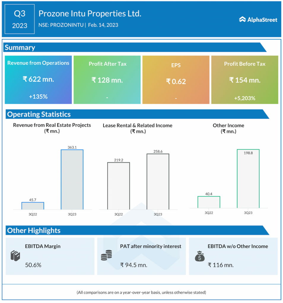 Prozone Intu Properties Ltd.’s revenue in Q3FY23 rose 135% to ₹ 622 millions. Consolidated Profit After Tax came at ₹ 128 millions in Q3FY23 showcasing a drastic rise on profitability. In this quarter’s results, the reports suggested that the firm has continued to deliver consistent performance in all key operational and financial indicators in Q3Y23.