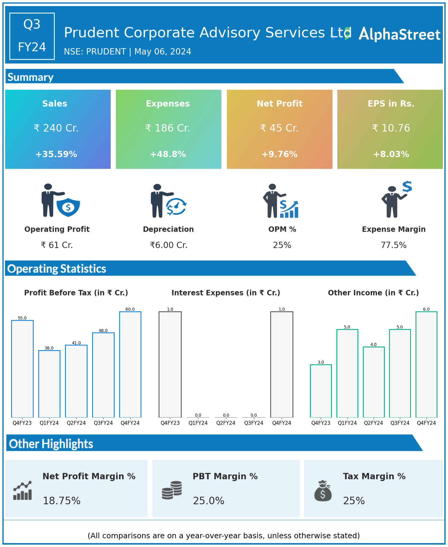 Prudent Corporate Advisory Services Ltd reported Revenues for Q4FY24 of ₹240.00 Crores up from ₹177.00 Crore year on year, a rise of 35.59%.