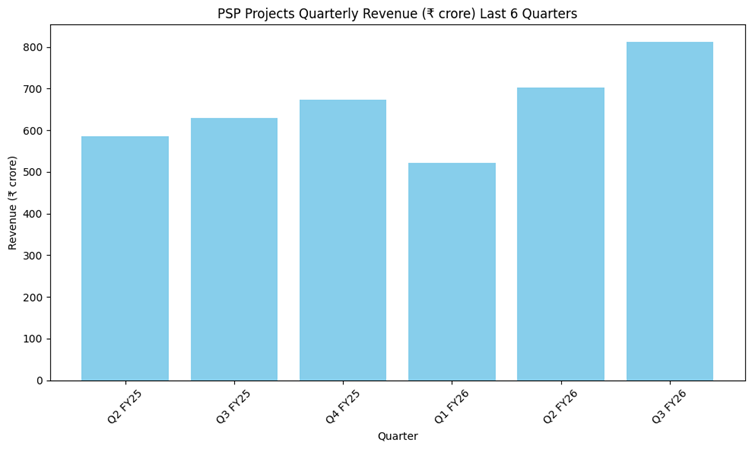 PSP Projects reported standalone revenue from operations of ₹771.22 crore in Q3 FY26, representing a 24% year-on-year increase and an 11% rise sequentially from the June quarter. Revenue growth was driven by higher project execution across segments.