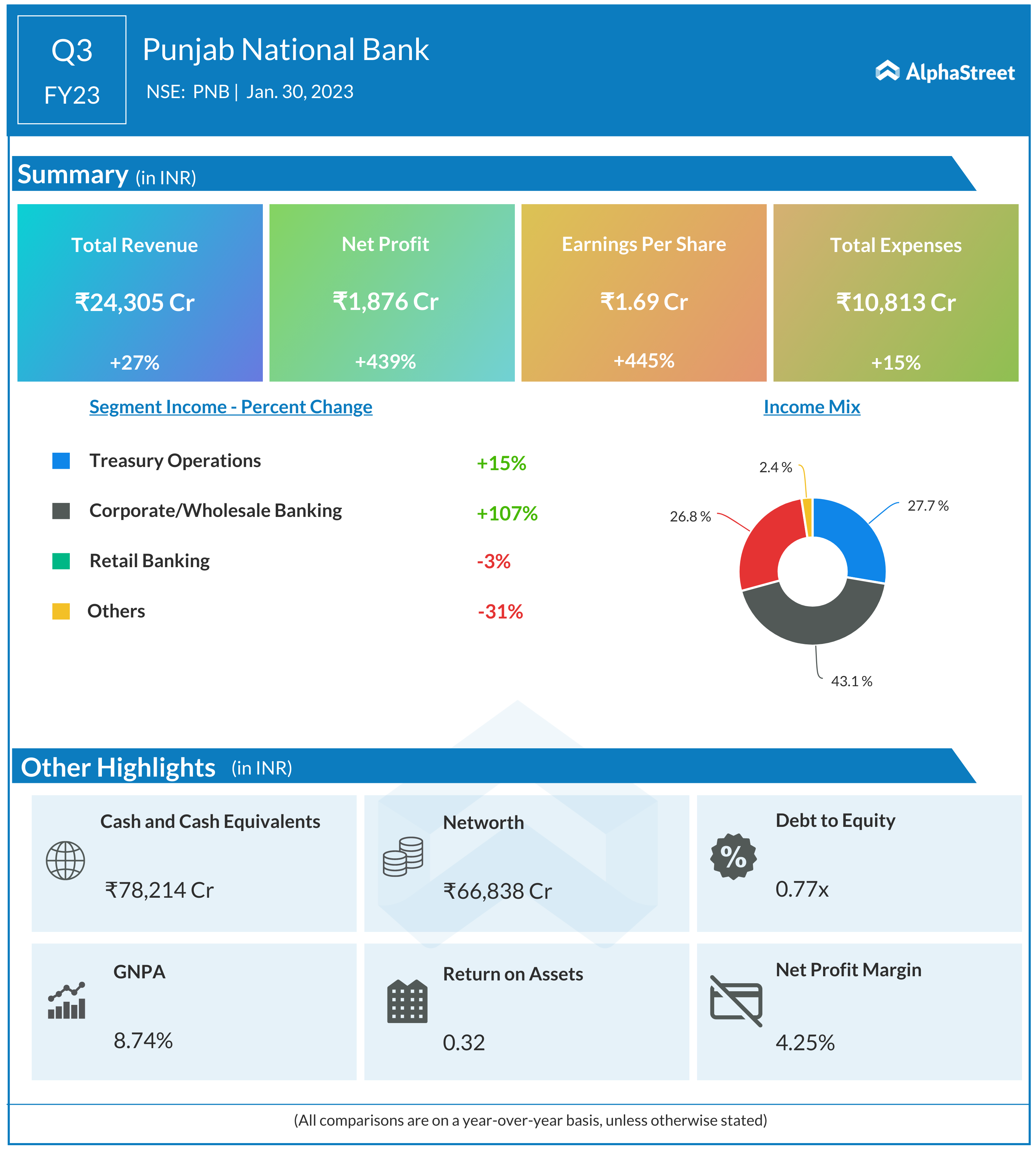 Punjab National Bank Ltd reported Total revenue for Q4 FY23 of ₹24,305 Crore, up from ₹19,090 Crore year on year depicting a growth of 27%. Consolidated Net Profit of ₹1,876 Crore, up 439% from ₹348 Crore in the same quarter of the previous year. The Earnings per Share is ₹1.69, up 445% from ₹0.31in the same quarter of the previous year.