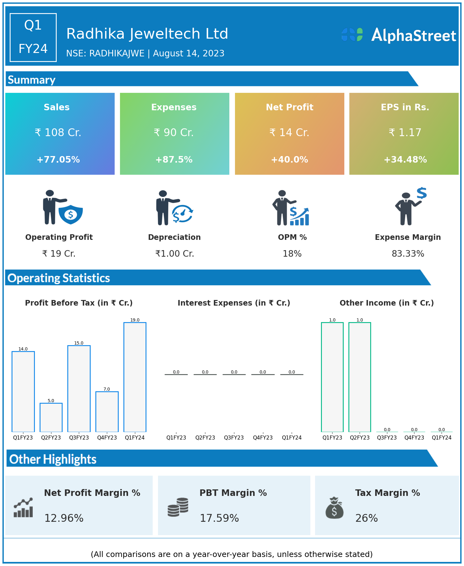 Radhika Jeweltech Ltd reported Revenues for Q1FY24 of ₹108.00 Crores up from ₹61.00 Crore year on year, a rise of 77.05%.