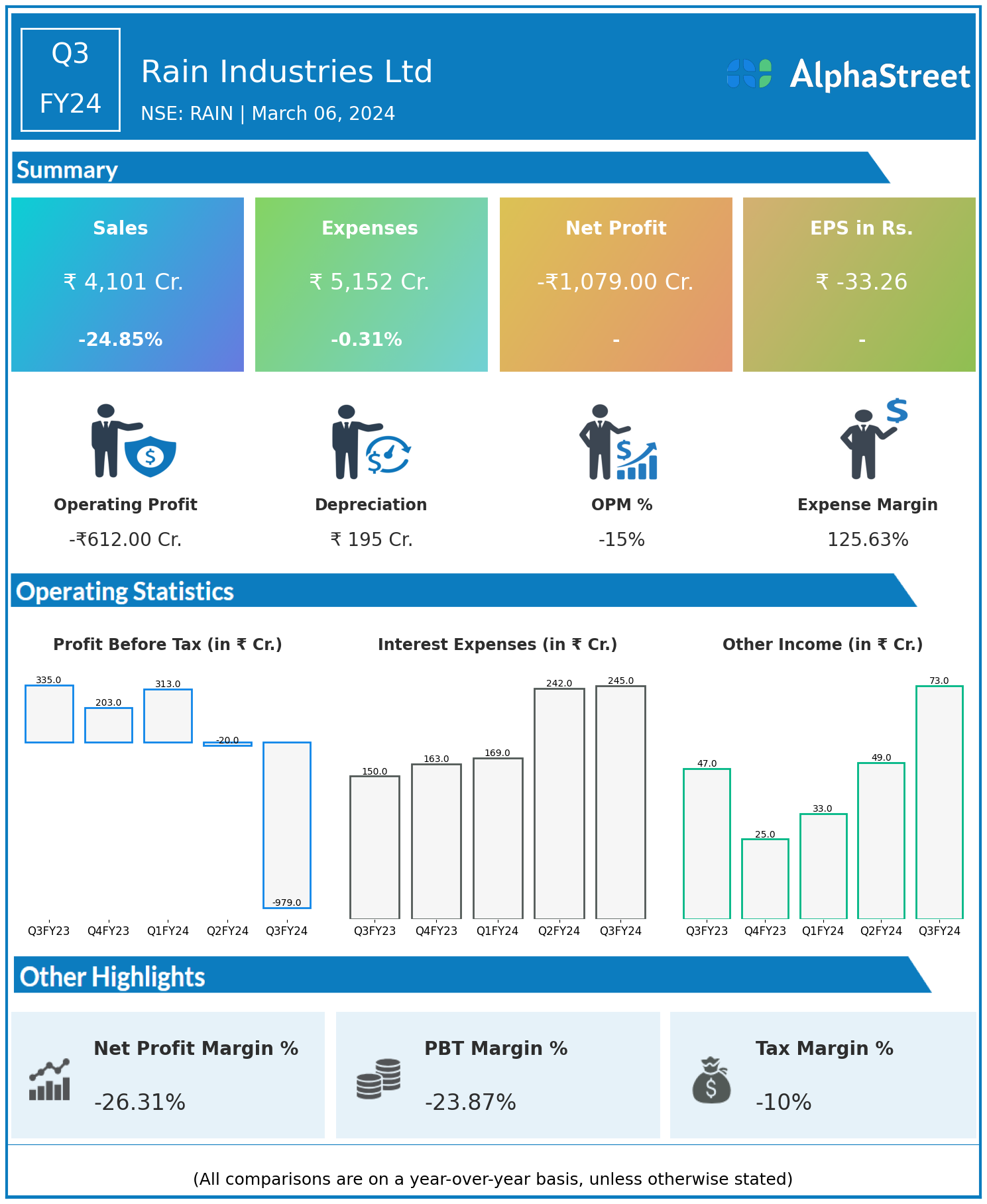 Rain Industries Ltd reported Revenues for Q3FY24 of ₹4,101.00 Crores down from ₹5,457.00 Crore year on year, a fall of 24.85%.