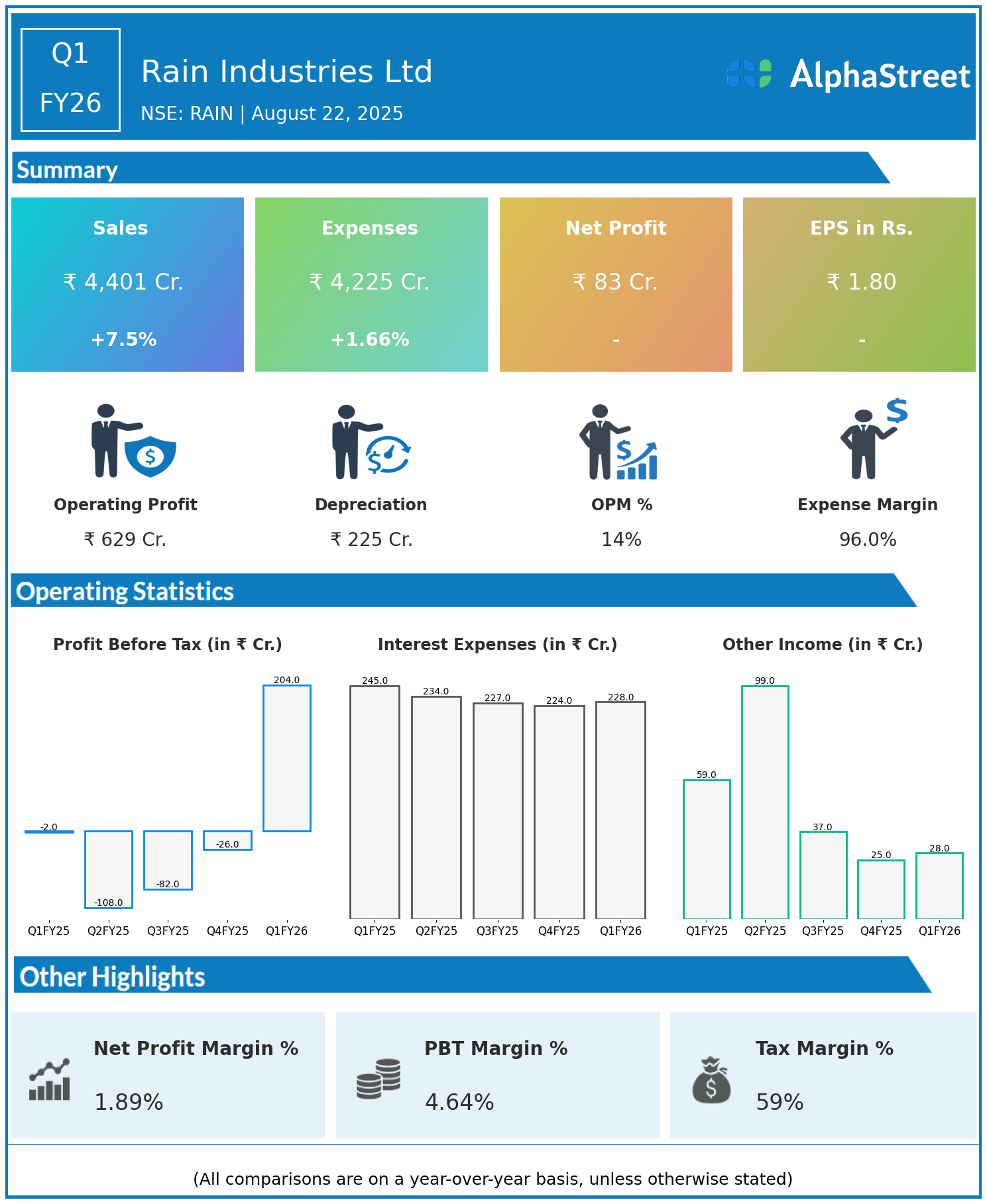 Rain Industries Limited (RAIN) is a leading vertically integrated producer of carbon, cement and Advanced materials products. Headquartered in India, RAIN has manufacturing facilities in eight countries across three continents. Presenting below are its Q1 FY26 earnings results.
