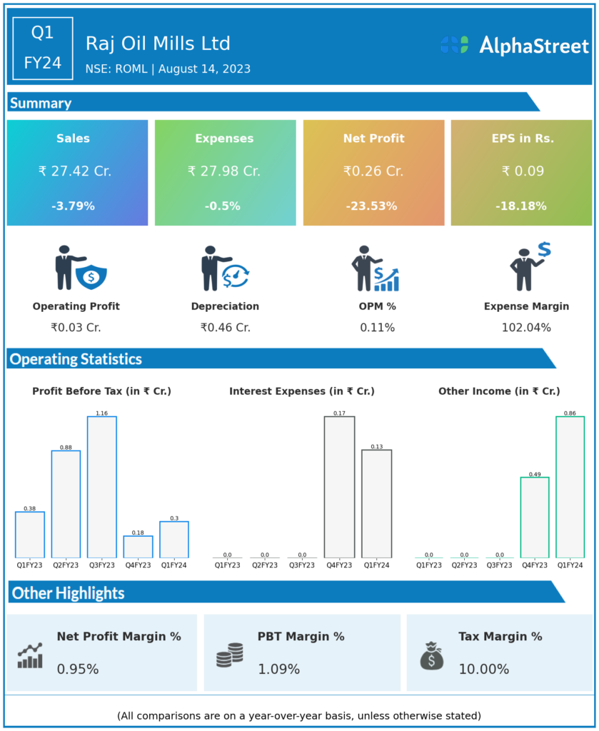 Raj Oil Mills Ltd reported Revenues for Q1FY24 of ₹27.42 Crores down from ₹28.50 Crore year on year, a fall of 3.79%.