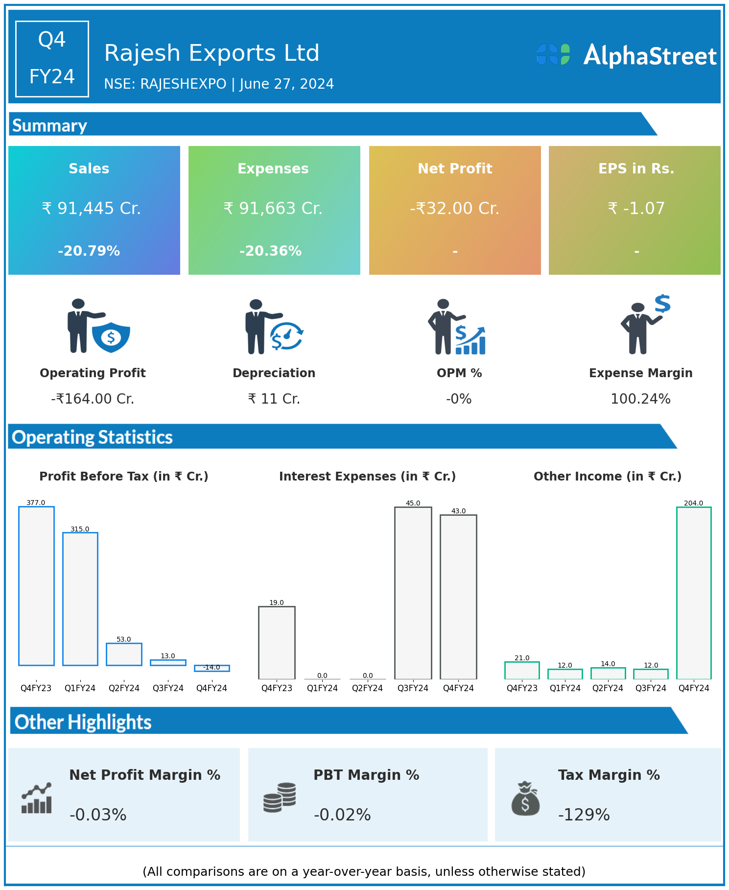 Rajesh Exports Ltd reported Revenues for Q4FY24 of ₹91,445.00 Crores down from ₹1,15,448.00 Crore year on year, a fall of 20.79%.