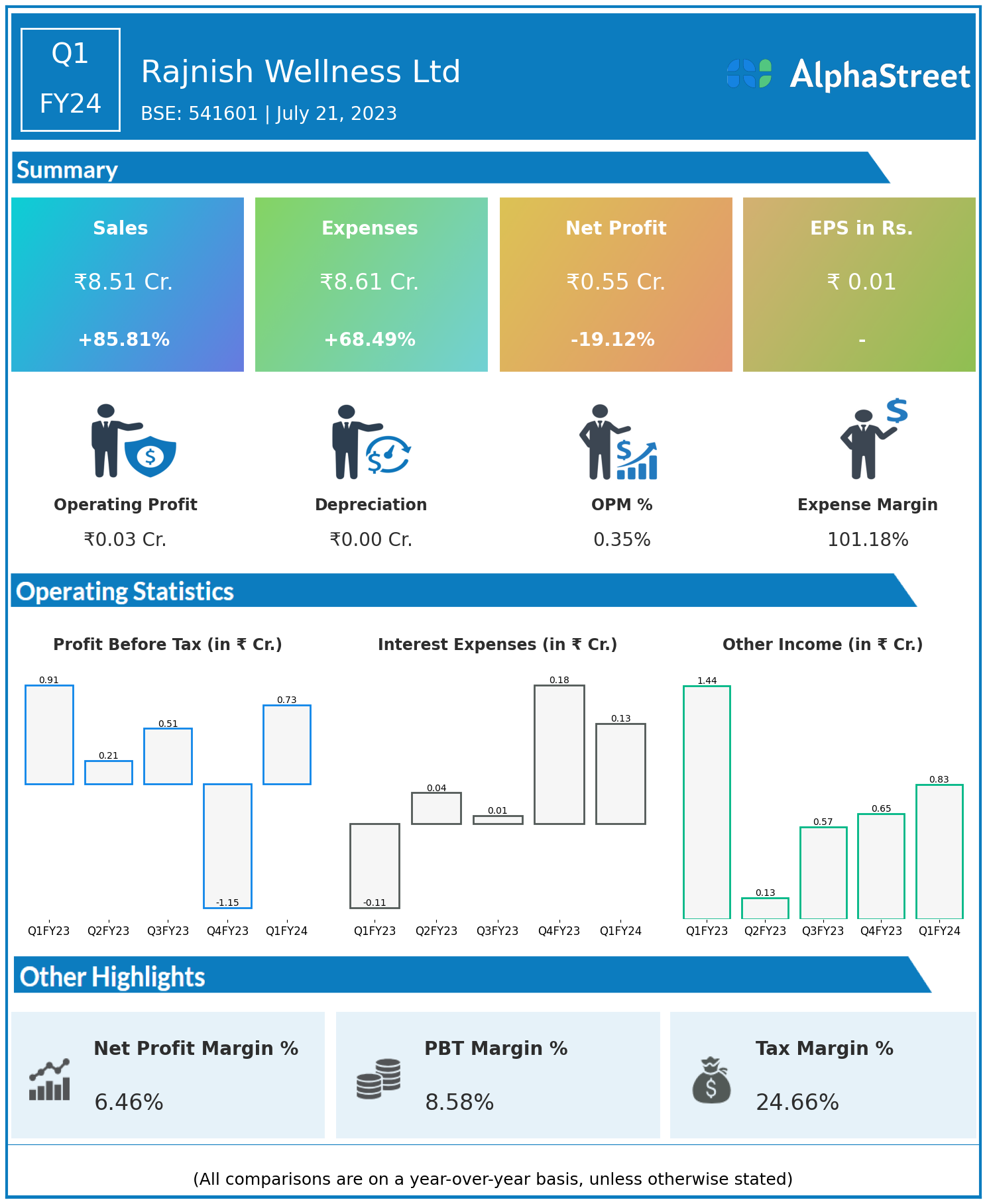 Rajnish Wellness Ltd reported Revenues for Q1FY24 of ₹8.51 Crores up from ₹4.58 Crore year on year, a rise of 85.81%.