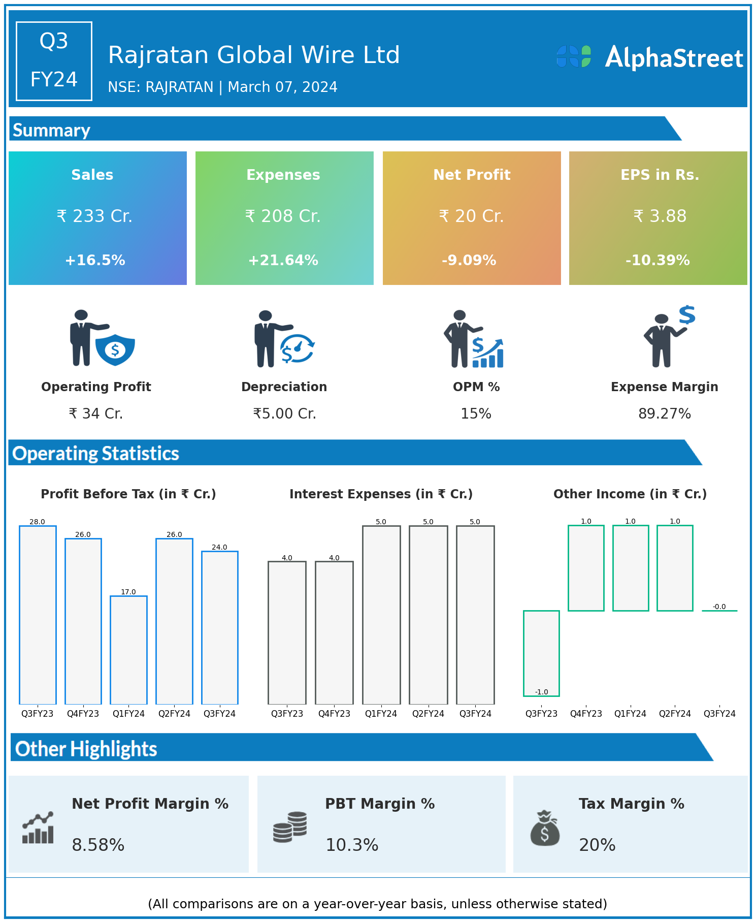 Rajratan Global Wire Ltd reported Revenues for Q3FY24 of ₹233.00 Crores up from ₹200.00 Crore year on year, a rise of 16.5%.
