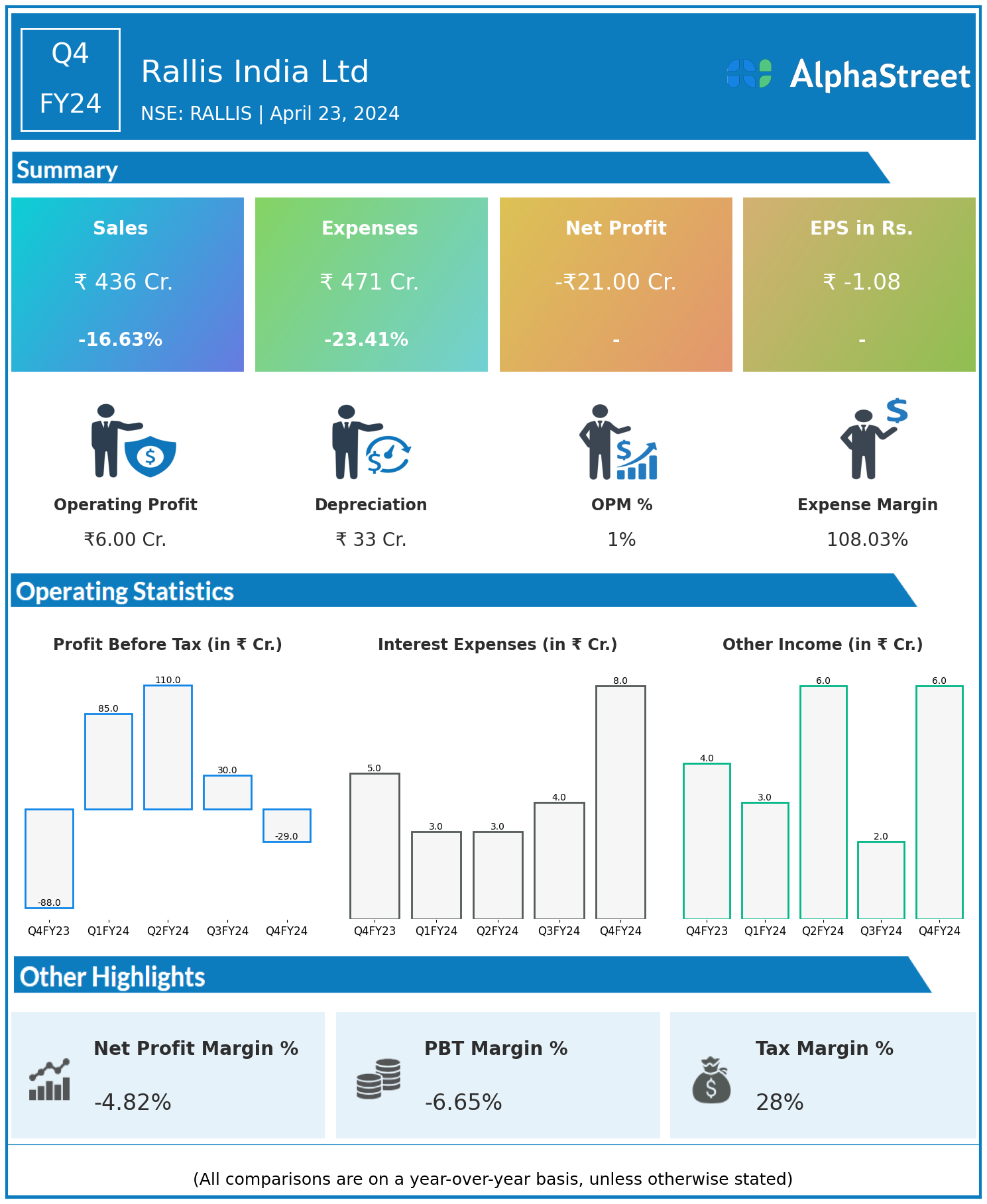 Rallis India Ltd reported Revenues for Q4FY24 of ₹436.00 Crores down from ₹523.00 Crore year on year, a fall of 16.63%.