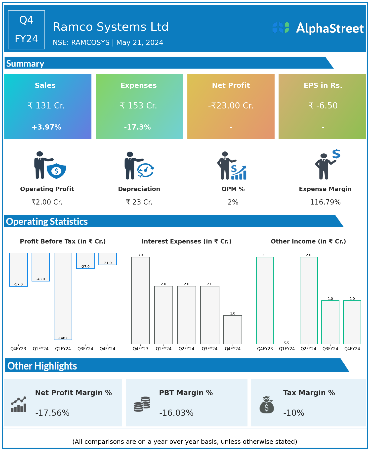 Ramco Systems Ltd reported Revenues for Q4FY24 of ₹131.00 Crores up from ₹126.00 Crore year on year, a rise of 3.97%.