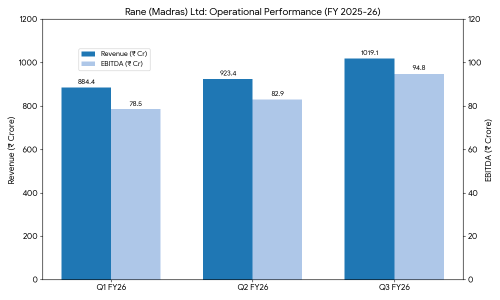 For the quarter ended December 31, 2025, Rane (Madras) reported a consolidated revenue of INR 1,019.1 crore, representing a 21.3 percent increase compared to INR 840.5 crore in the same period of the previous year.