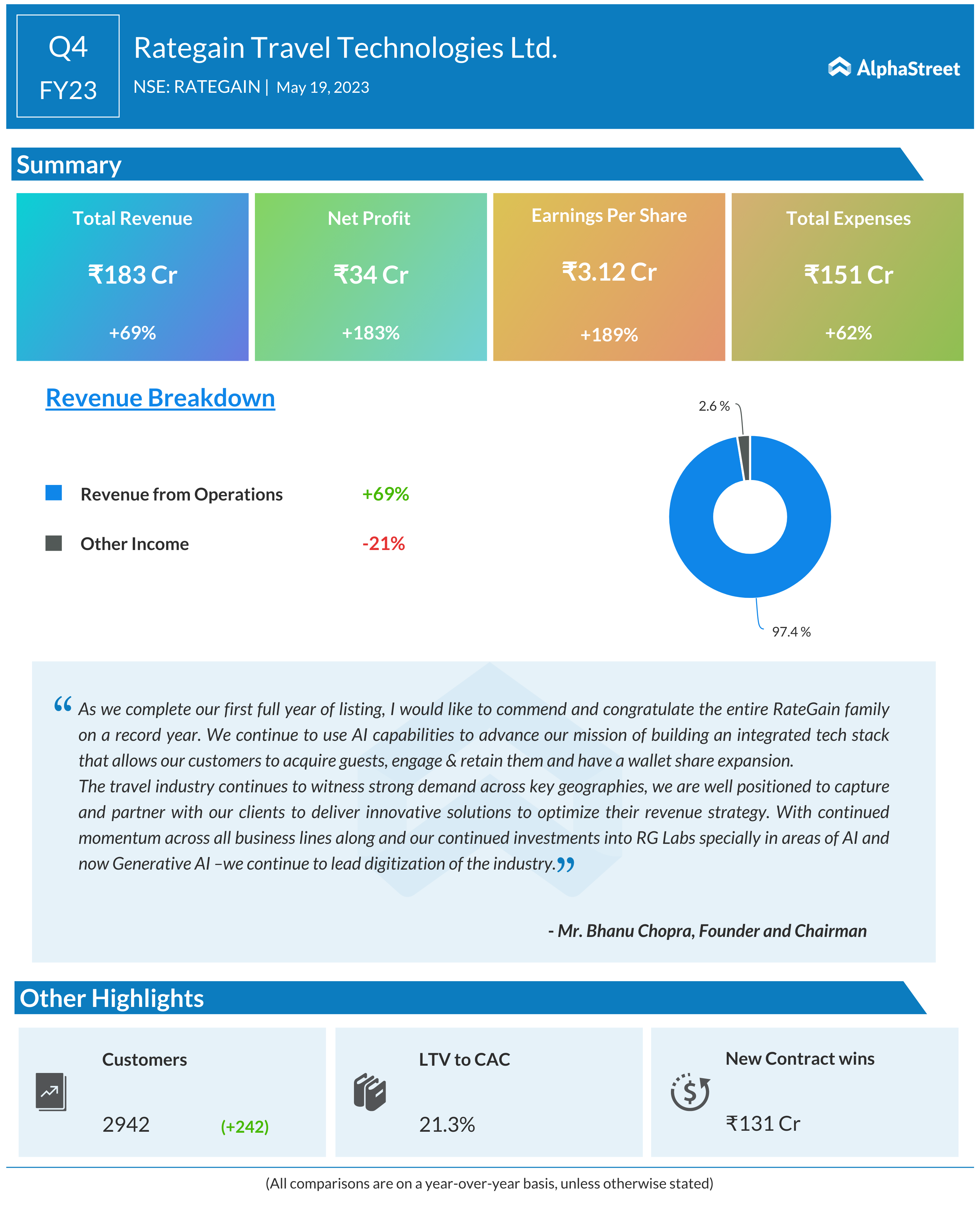 Rategain Travel Technologies Ltd reported Total revenue for Q4 FY23 of ₹183 Crore, up from ₹108 Crore year on year depicting a growth of 69%. Consolidated Net Profit of ₹34 Crore, up 183% from ₹12 Crore in the same quarter of the previous year. The Earnings per Share is ₹3.12, up 189% from ₹1.08 in the same quarter of the previous year.