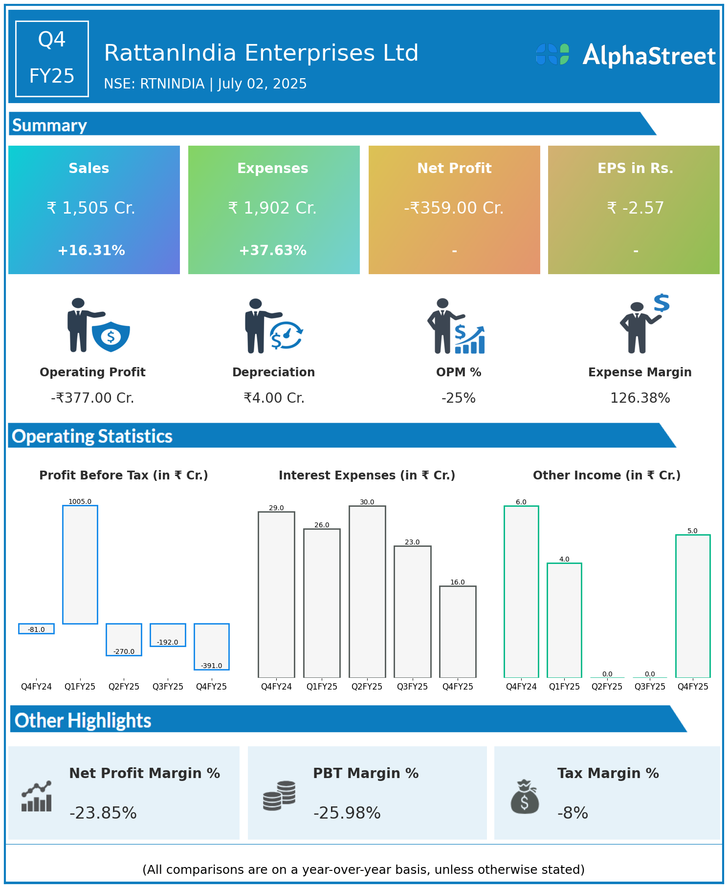 RattanIndia Enterprises Ltd reported Revenues for Q4FY25 of ₹1,505.00 Crores up from ₹1,294.00 Crore year on year, a rise of 16.31%.