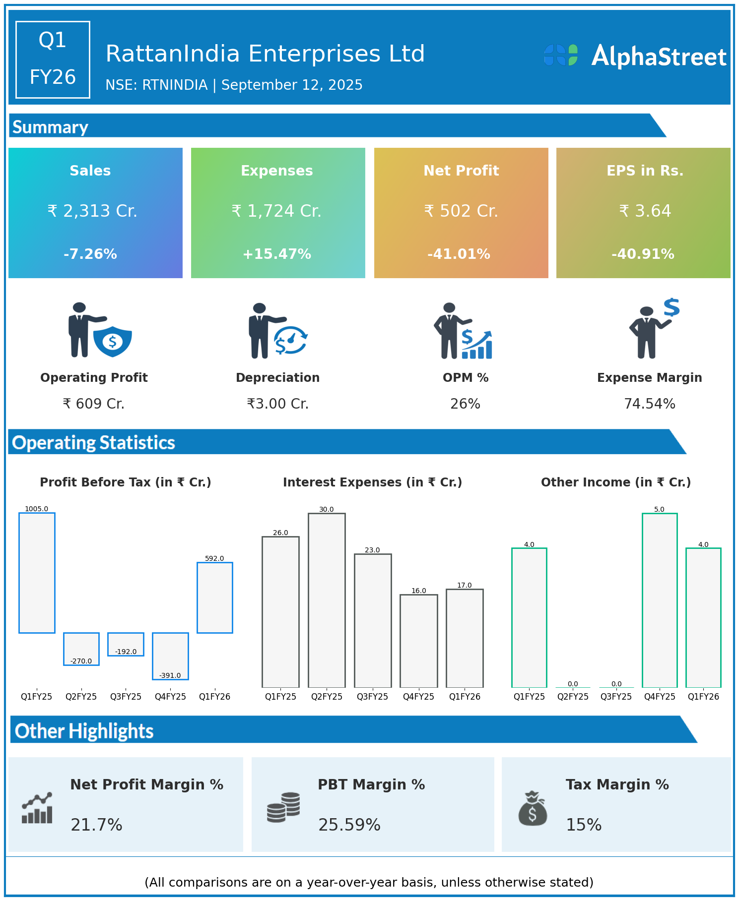 RattanIndia Enterprises Limited is the flagship company of Rattanindia Group. RattanIndia Enterprises Limited comprises of tech focussed new age businesses including e-commerce, electric vehicles, and drones. Presenting below are its Q1 FY26 earnings results.