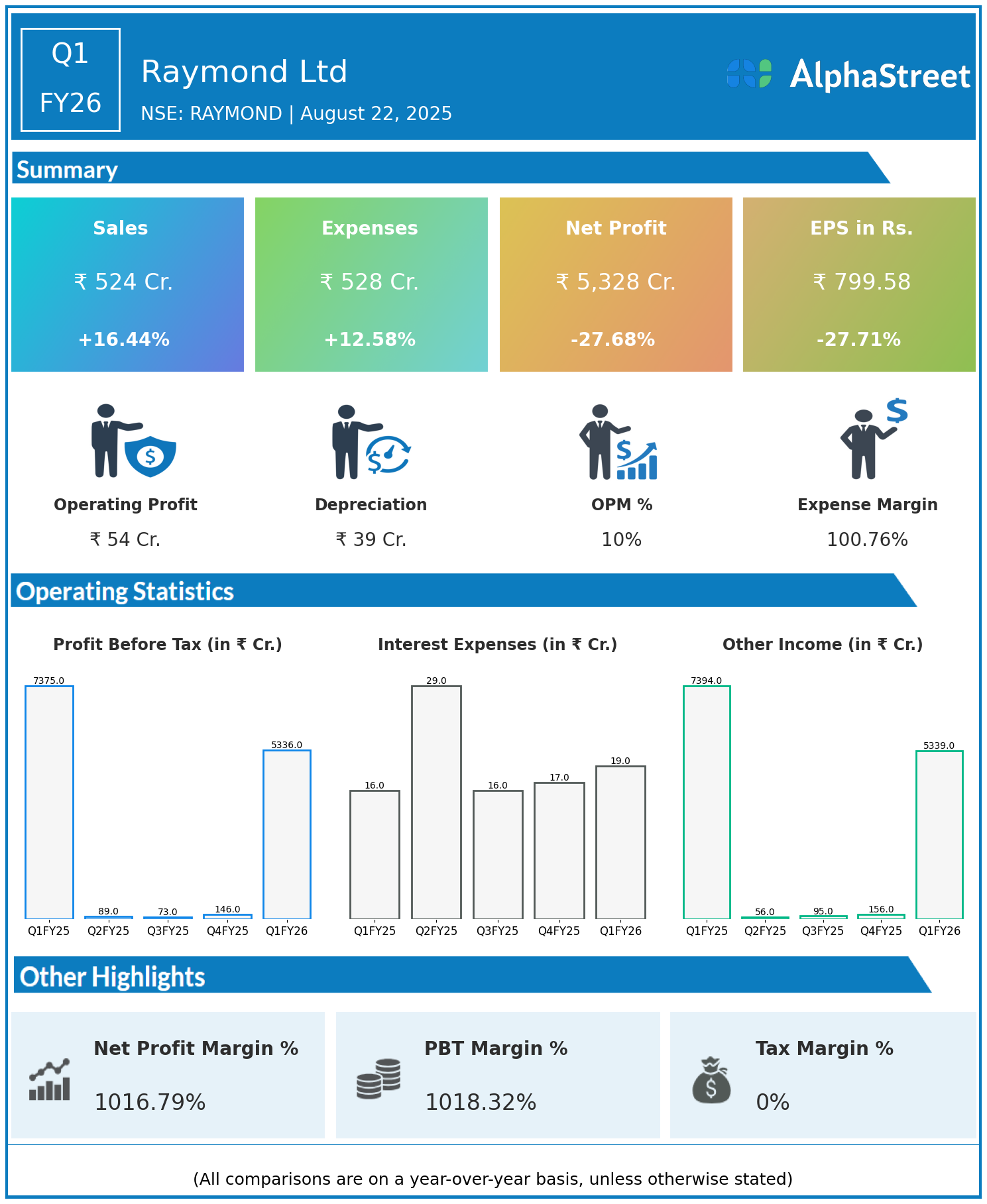 Raymond Limited incorporated in 1925 is a diversified group with interests in Textile & Apparel sectors as well as presence across diverse segments such as Real Estate, FMCG, Engineering in national and international markets 55+ Countries including the USA, Europe, Japan & Middle East. The Company has a retail network of 1,638 stores, including 1,589 stores in about 600 towns and cities in India and 49 overseas stores in nine countries. It is one of the largest vertically and horizontally integrated manufacturers of worsted suiting fabric in the world. Presenting below are its Q1 FY26 earnings results.