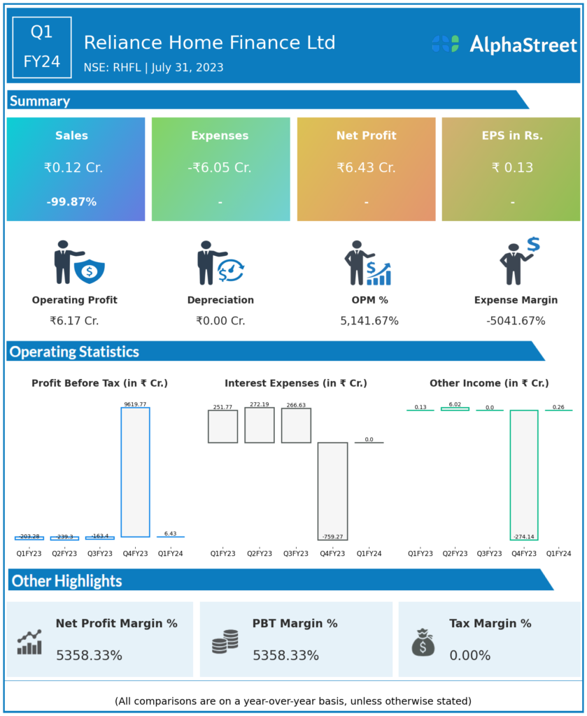 Reliance Home Finance Ltd reported Revenues for Q1FY24 of ₹0.12 Crores down from ₹93.63 Crore year on year, a fall of 99.87%.
