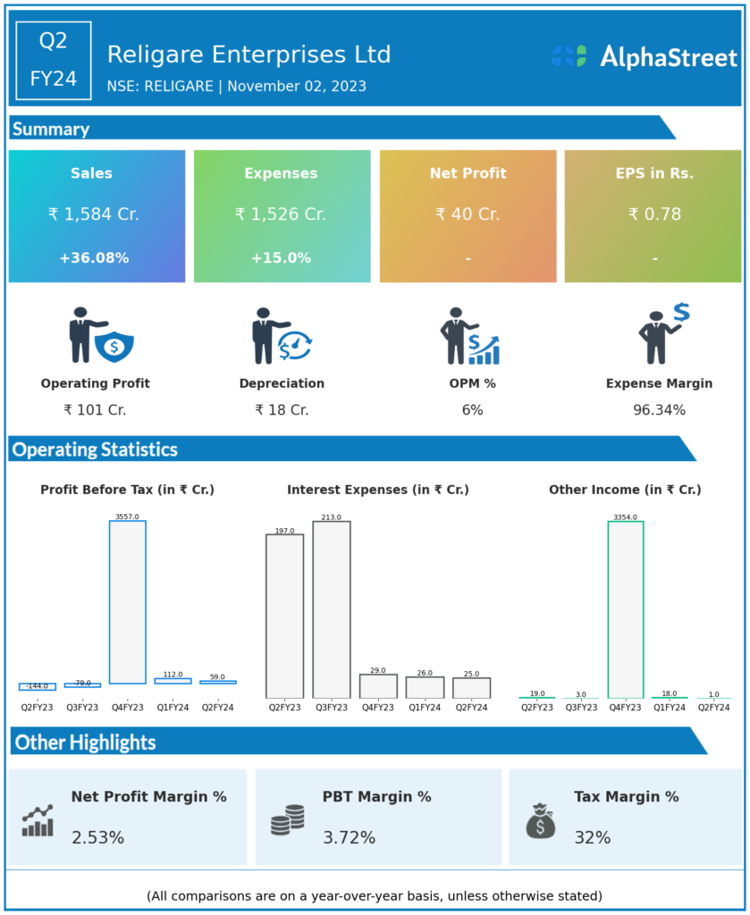 Religare Enterprises Ltd reported Revenues for Q2FY24 of ₹1,584.00 Crores up from ₹1,164.00 Crore year on year, a rise of 36.08%.