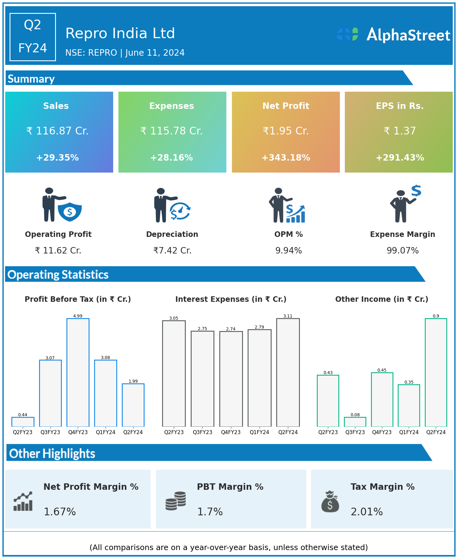 Total Expenses for Q2FY24 of ₹115.78 Crores up from ₹90.34 Crores year on year, a rise of 28.16%.