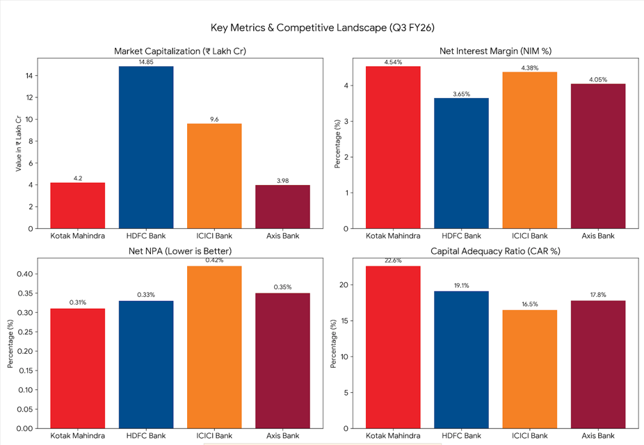 Kotak Mahindra Bank continues to prioritize “Return on Risk” over simple volume growth. The following chart reflects the current financial standing of Kotak against its primary competitors.