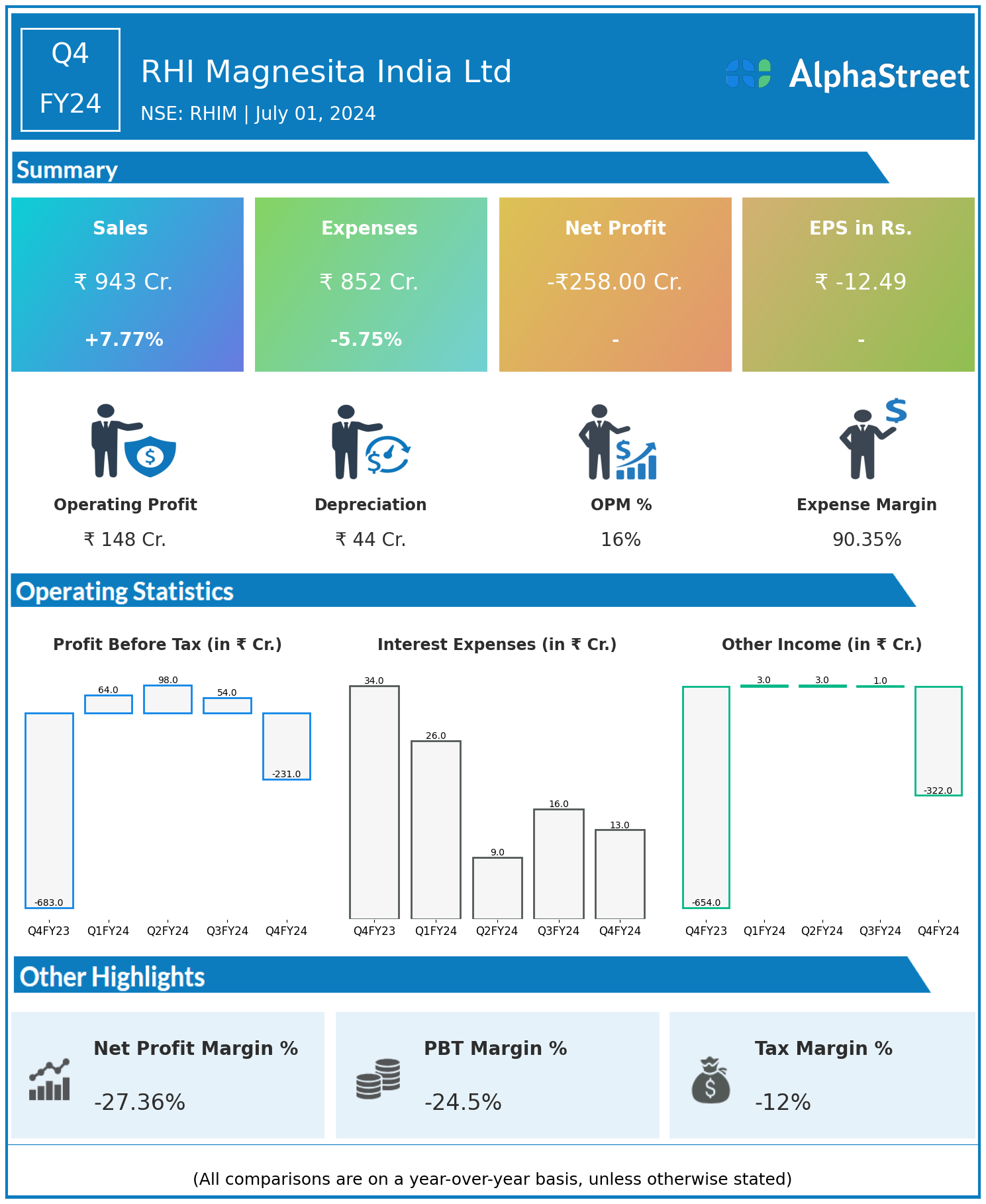 RHI Magnesita India Ltd reported Revenues for Q4FY24 of ₹943.00 Crores up from ₹875.00 Crore year on year, a rise of 7.77%.