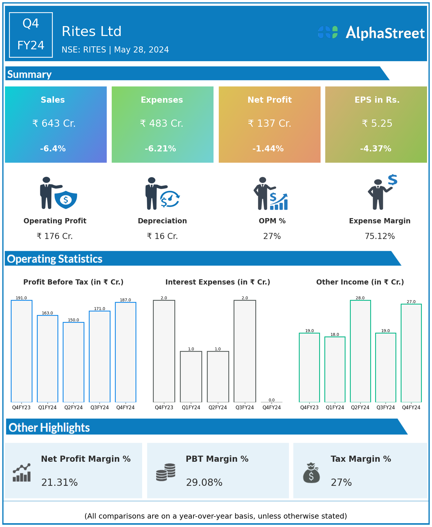 Rites Ltd reported Revenues for Q4FY24 of ₹643.00 Crores down from ₹687.00 Crore year on year, a fall of 6.4%.