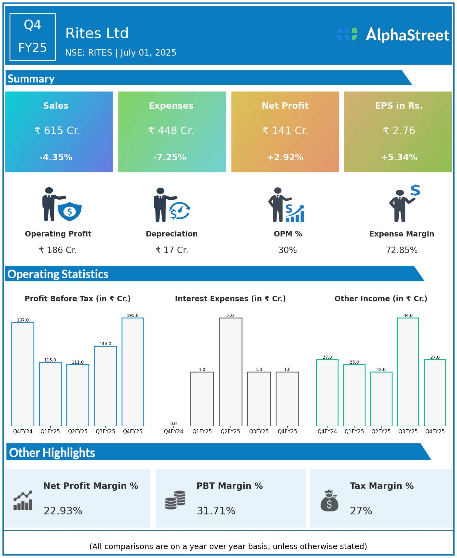 Rites Ltd reported Revenues for Q4FY25 of ₹615.00 Crores down from ₹643.00 Crore year on year, a fall of 4.35%.