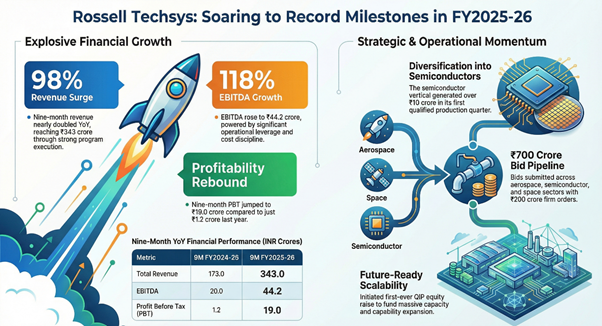 Rossell Techsys Limited (NSE: ROSSTECH) the aerospace and defense manufacturer achieved 72% year-over-year quarterly revenue growth and is initiating its first-ever Qualified Institutional Placement to fund capacity expansion into semiconductor and space sectors.