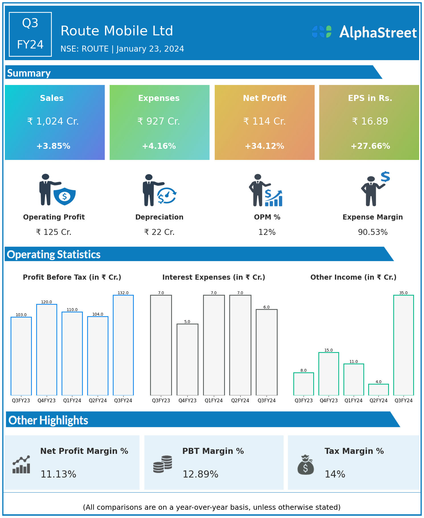 Route Mobile Ltd reported Revenues for Q3FY24 of ₹1,024.00 Crores up from ₹986.00 Crore year on year, a rise of 3.85%.
