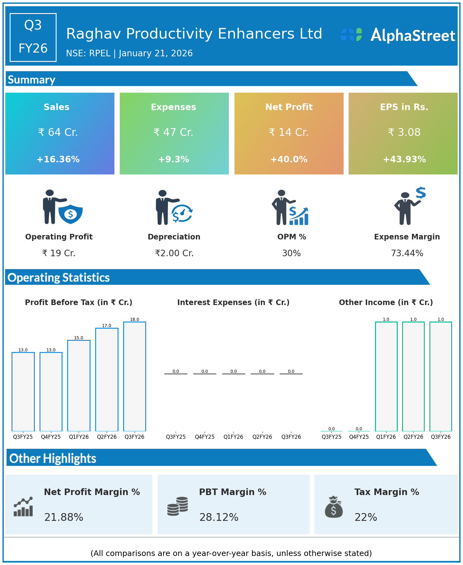 Raghav Productivity Enhancers Ltd reported Revenues for Q3FY26 of ₹64.00 Crores up from ₹55.00 Crore year on year, a rise of 16.36%.