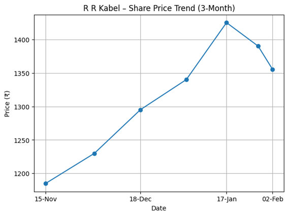 R R Kabel Ltd (BSE/NSE: RRKABEL) shares closed at ₹1,355.50 on February 2, 2026, down approximately 1.55% on the day. The stock price movement follows the company’s release of unaudited Q3 and nine-month fiscal 2026 results.