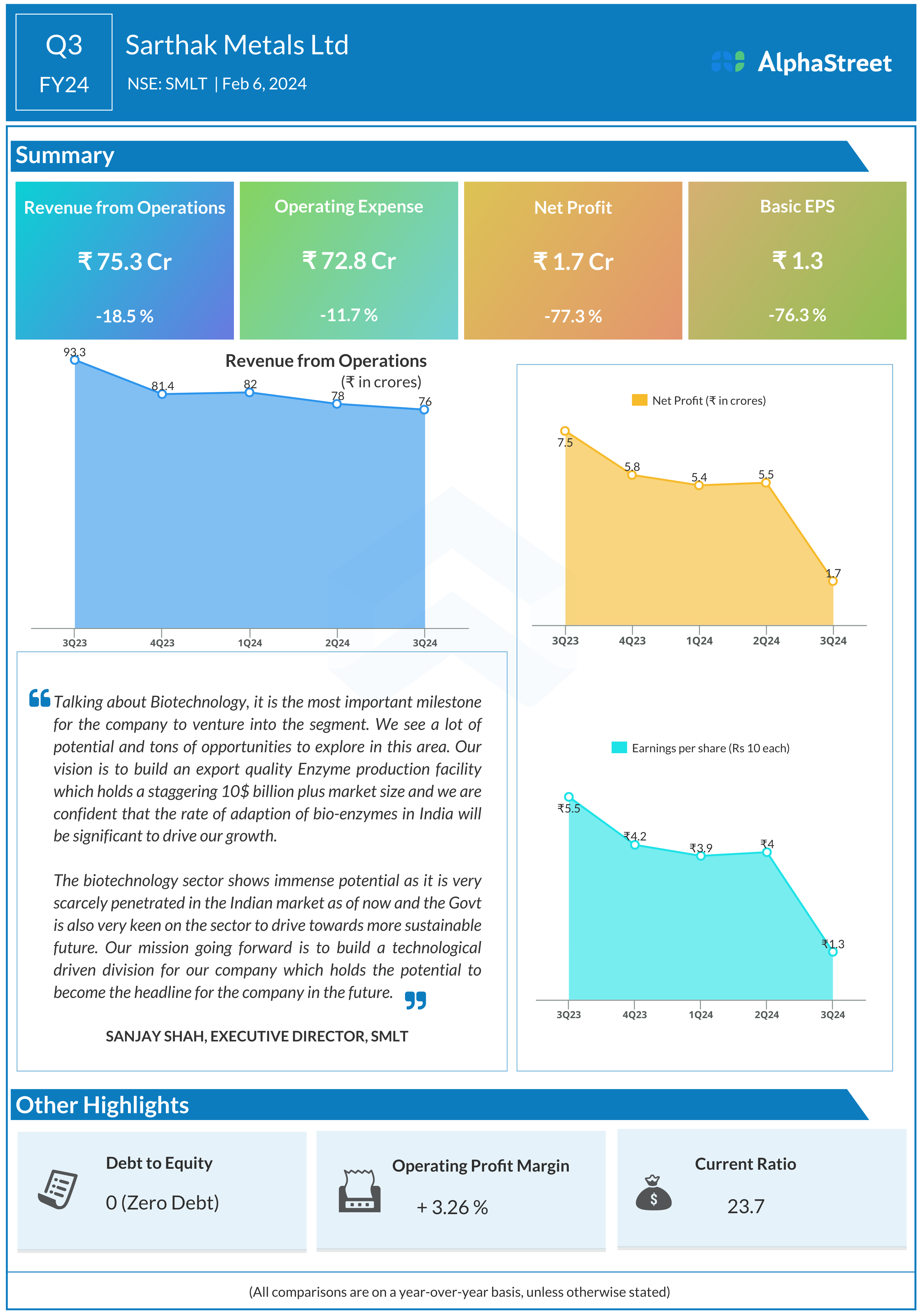 Sarthak Metals Ltd reported Revenues for Q3FY24 of ₹75.30 Crores down from ₹92.56 Crore year on year, a fall of 18.65%.