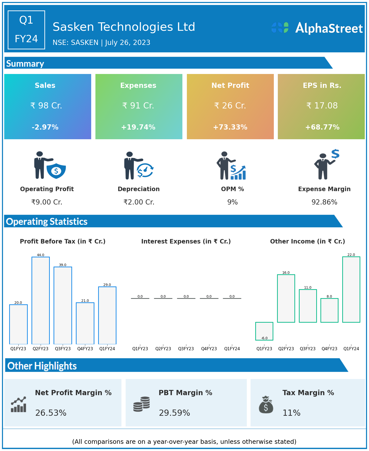 Sasken Technologies Ltd reported Revenues for Q1FY24 of ₹98.00 Crores down from ₹101.00 Crore year on year, a fall of 2.97%.