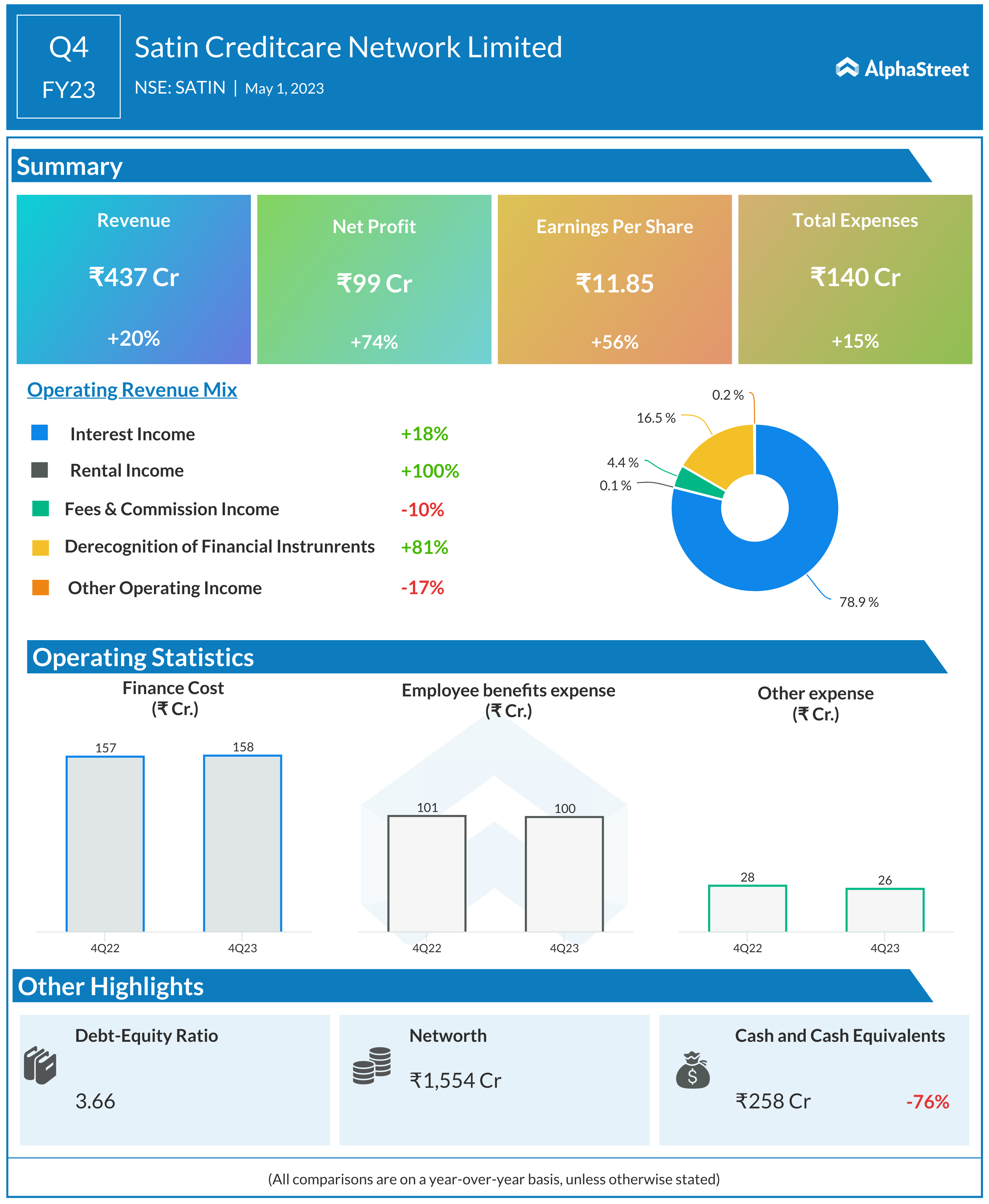 Satin Creditcare Network Limited reported Total revenue for Q4 FY23 of ₹437 Crore, up from ₹363 Crore year on year depicting a growth of 20%. While the consolidated Net Profit of ₹99 Crore, up 74% from ₹57 Crore in the same quarter of the previous year. The Earnings per Share is ₹11.85, up 56% from ₹7.58 in the same quarter of the previous year.