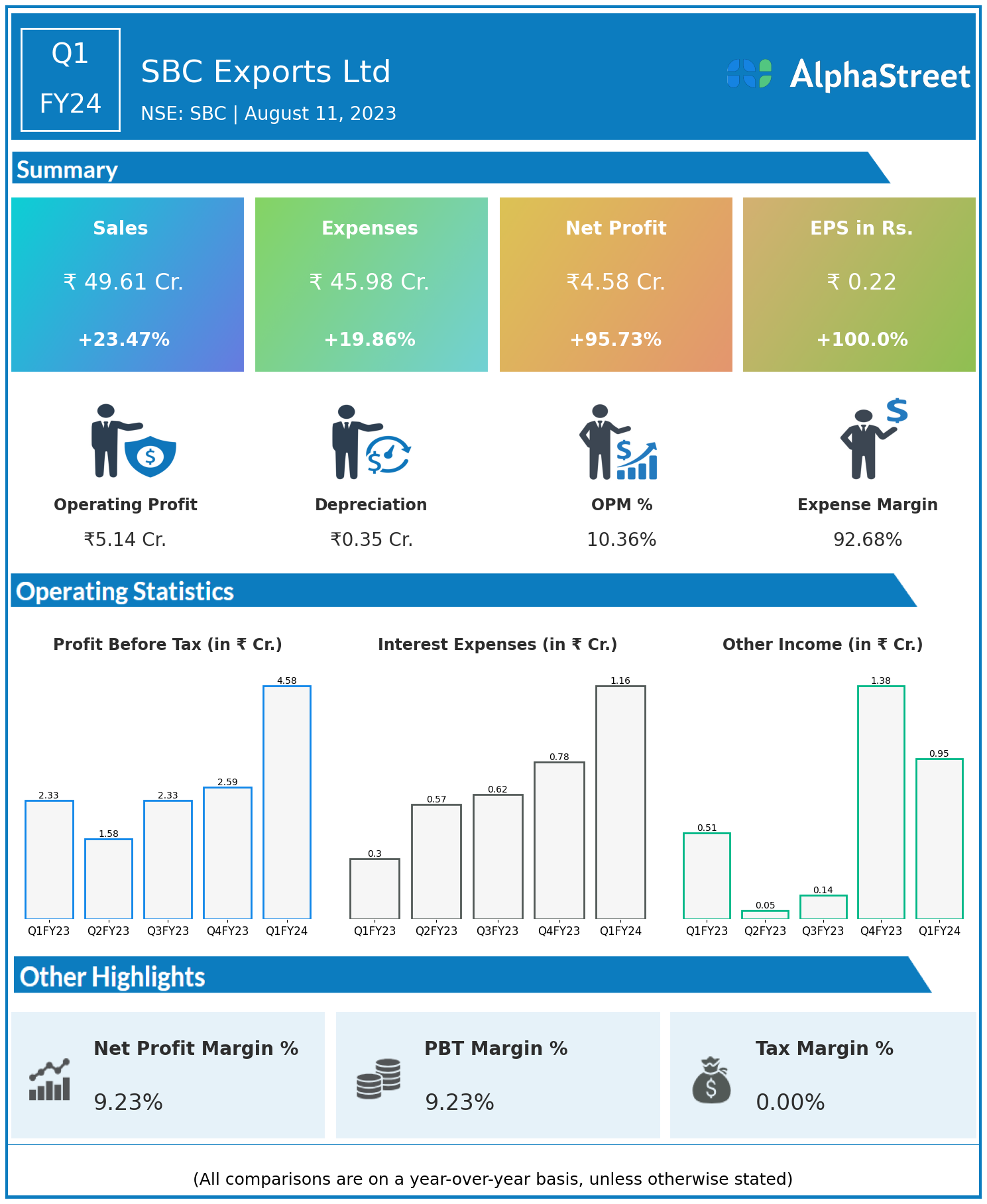 SBC Exports Ltd reported Revenues for Q1FY24 of ₹49.61 Crores up from ₹40.18 Crore year on year, a rise of 23.47%.