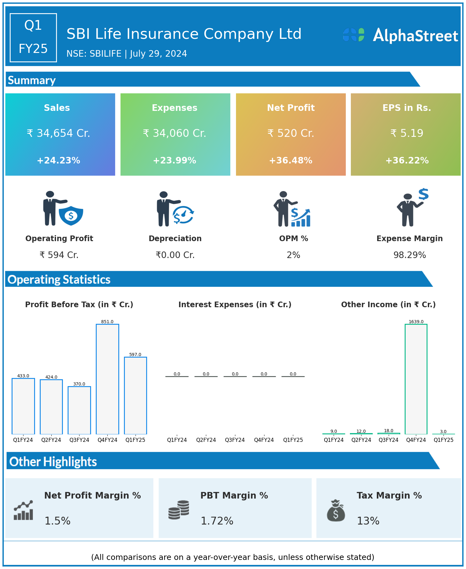 SBI Life Insurance Company Ltd reported Revenues for Q1FY25 of ₹34,654.00 Crores up from ₹27,895.00 Crore year on year, a rise of 24.23%.