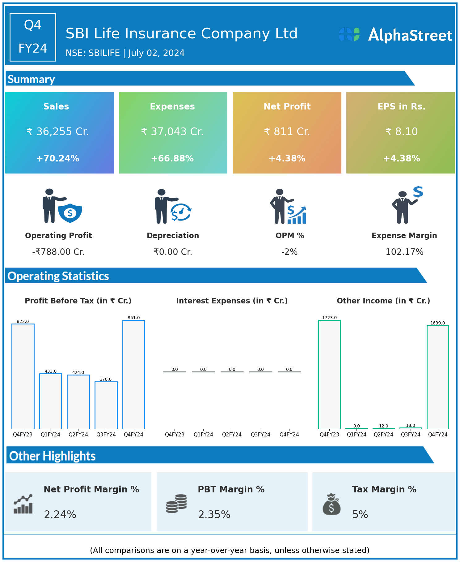 SBI Life Insurance Company Ltd reported Revenues for Q4FY24 of ₹36,255.00 Crores up from ₹21,296.00 Crore year on year, a rise of 70.24%.