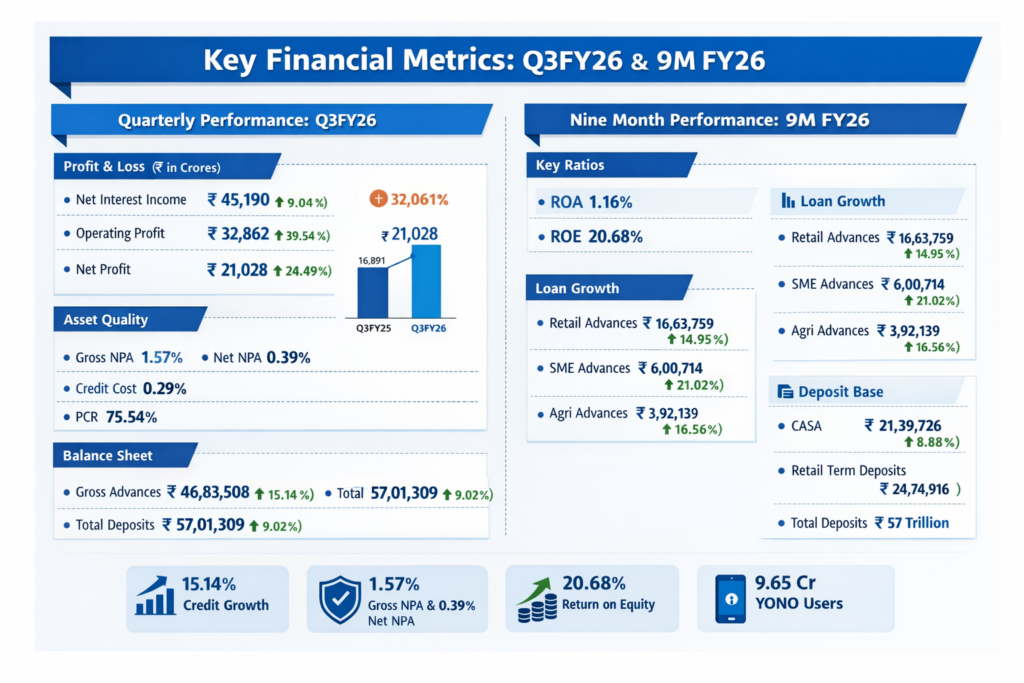 - For the nine-month period (9MFY26), the bank recorded a net profit of ₹60,348 crores, up 15.48% from the previous year.