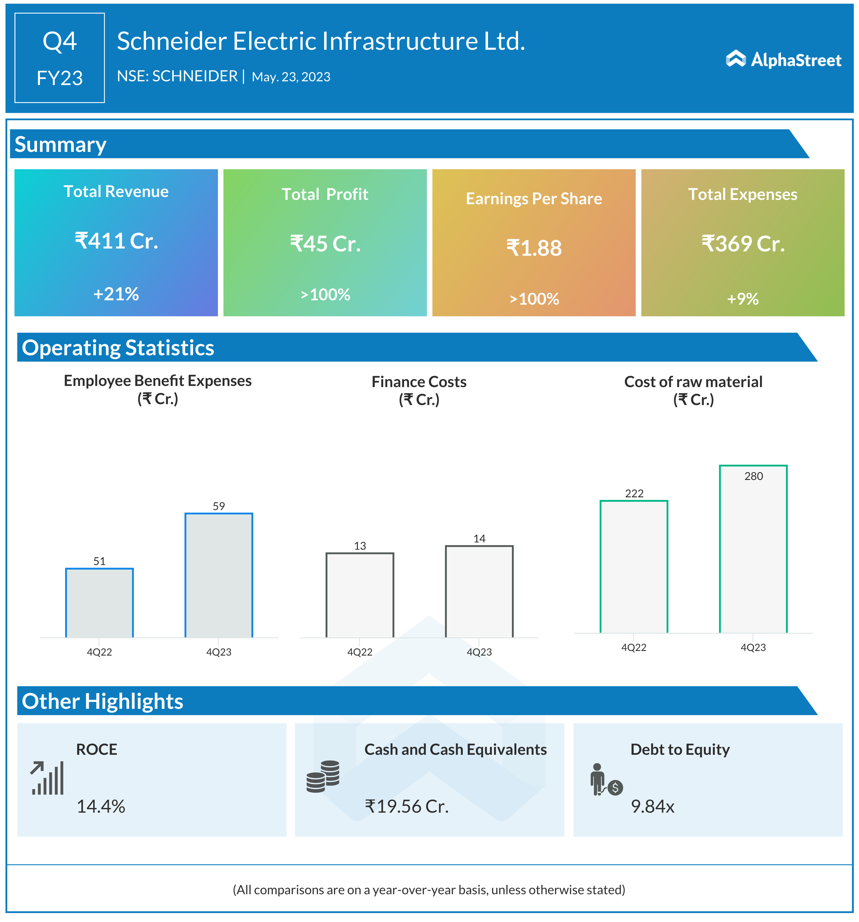 Schneider Electric Infrastructure Ltd reported Total revenue for Q4 FY23 of ₹411 Crore, up from ₹340 Crore year on year depicting a growth of 21%. Consolidated Net Profit of ₹45 Crore, up more than 100% from ₹0.07 Crore in the same quarter of the previous year. The Earnings per Share is ₹1.88, up more than 100% from ₹0 in the same quarter of the previous year.