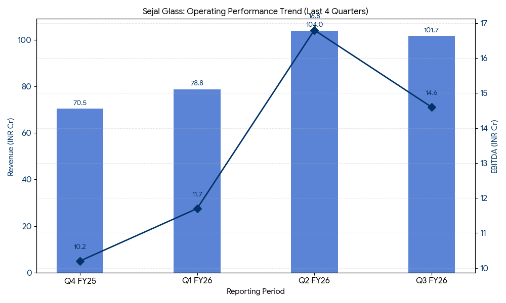 For the third quarter ended December 31, 2025 (Q3 FY26), Sejal Glass reported consolidated revenue from operations of ₹101.70 crore, representing a 63.9% increase from ₹62.04 crore in the corresponding quarter of the previous fiscal year. Consolidated net profit for the period rose to ₹5.08 crore, up 49.1% from ₹3.40 crore in Q3 FY25.