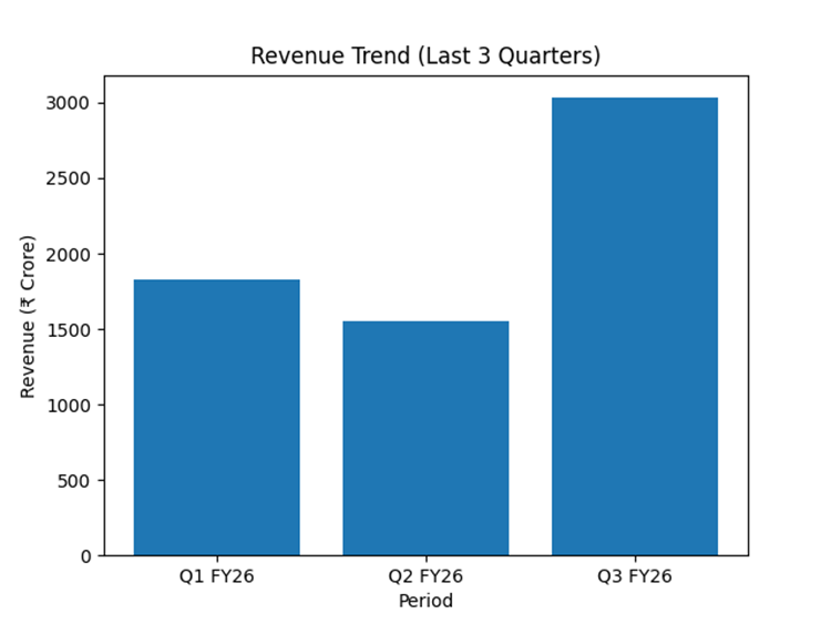 Q1 FY26 revenue: ₹1826 crore. Q2 FY26 revenue: ₹1554 crore. Q3 FY26 revenue: ₹3032 crore. Q3 reflects significant sequential growth. Nine-month performance shows seasonal variation.