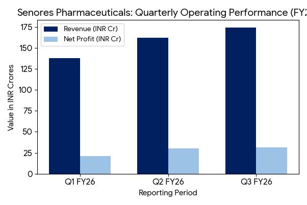 For the third quarter ended December 31, 2025 (Q3 FY26), Senores Pharmaceuticals reported a consolidated revenue of ₹174.56 crore, representing a year-over-year increase of 69.44% from ₹103.02 crore in the corresponding period last year. Consolidated net profit for the quarter rose 84.28% to ₹31.66 crore, compared to ₹17.18 crore in Q3 FY25.