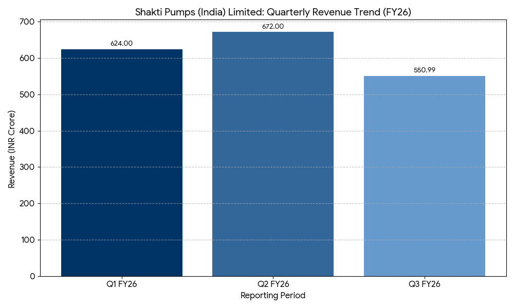 For the quarter ended December 31, 2025 (Q3 FY26), Shakti Pumps reported a consolidated revenue from operations of INR 550.99 crore, a decrease of 15.07% compared to INR 648.77 crore in the same period last year. Consolidated net profit for the quarter stood at INR 31.70 crore, down 69.53% from INR 104.05 crore in Q3 FY25.
