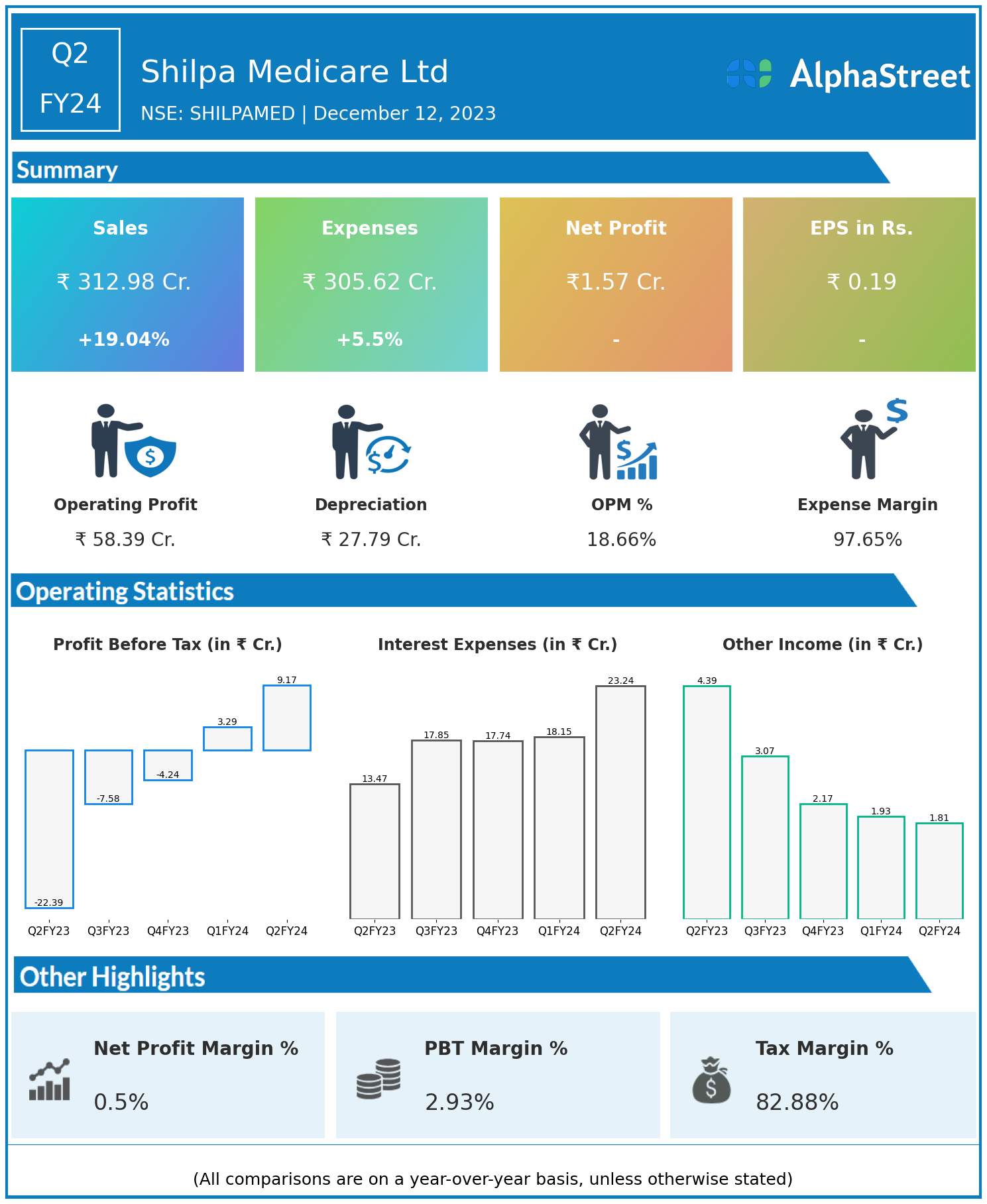 Shilpa Medicare Ltd reported Revenues for Q2FY24 of ₹312.98 Crores up from ₹262.91 Crore year on year, a rise of 19.04%.